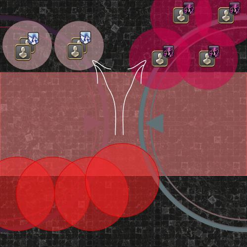 | 1. Hraesvelgr appears along either the North or South edge together with the first set of Sable Price eyes (that will always spawn center). Move to the East or West edge to avoid Hraesvelgr's Cauterize (this will be West, next to Nidhogg 2 out of 3 times) (In this example, Hraesvelgr's Cauterize will hit the east half, so the party moves West next to Nidhogg.) | ![]() |